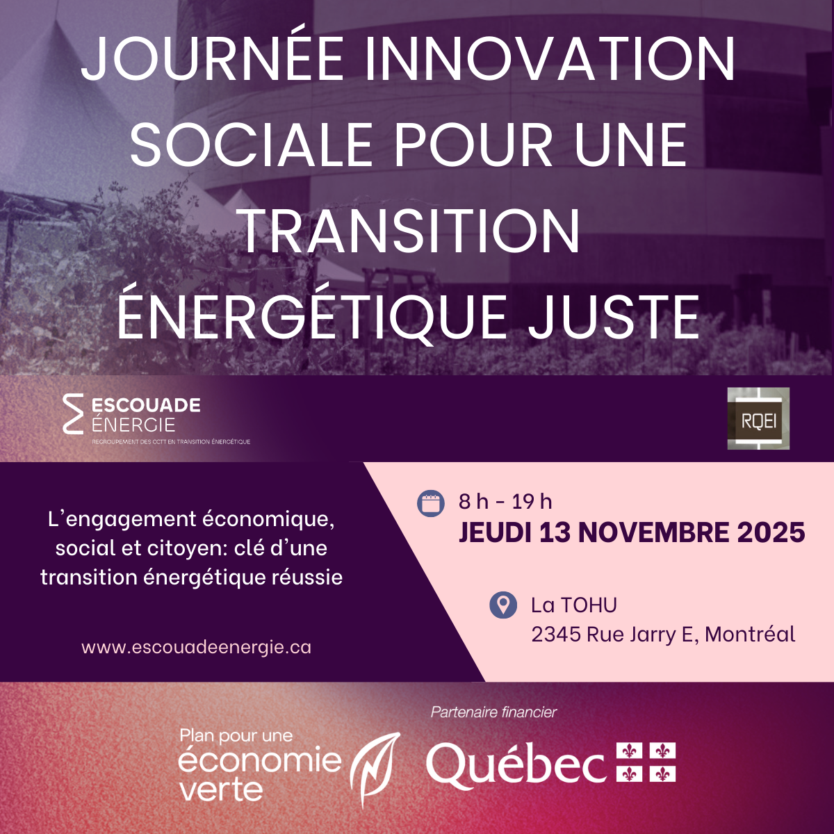 Vous avez vous aussi à cœur de renforcer l’écosystème québécois en transition énergétique? Faites-le savoir en présentant l’événement ou l’une de ses activités! Les formules sont disponibles ici: https://escouadeenergie.ca/journee-innovation-sociale-partenaires/