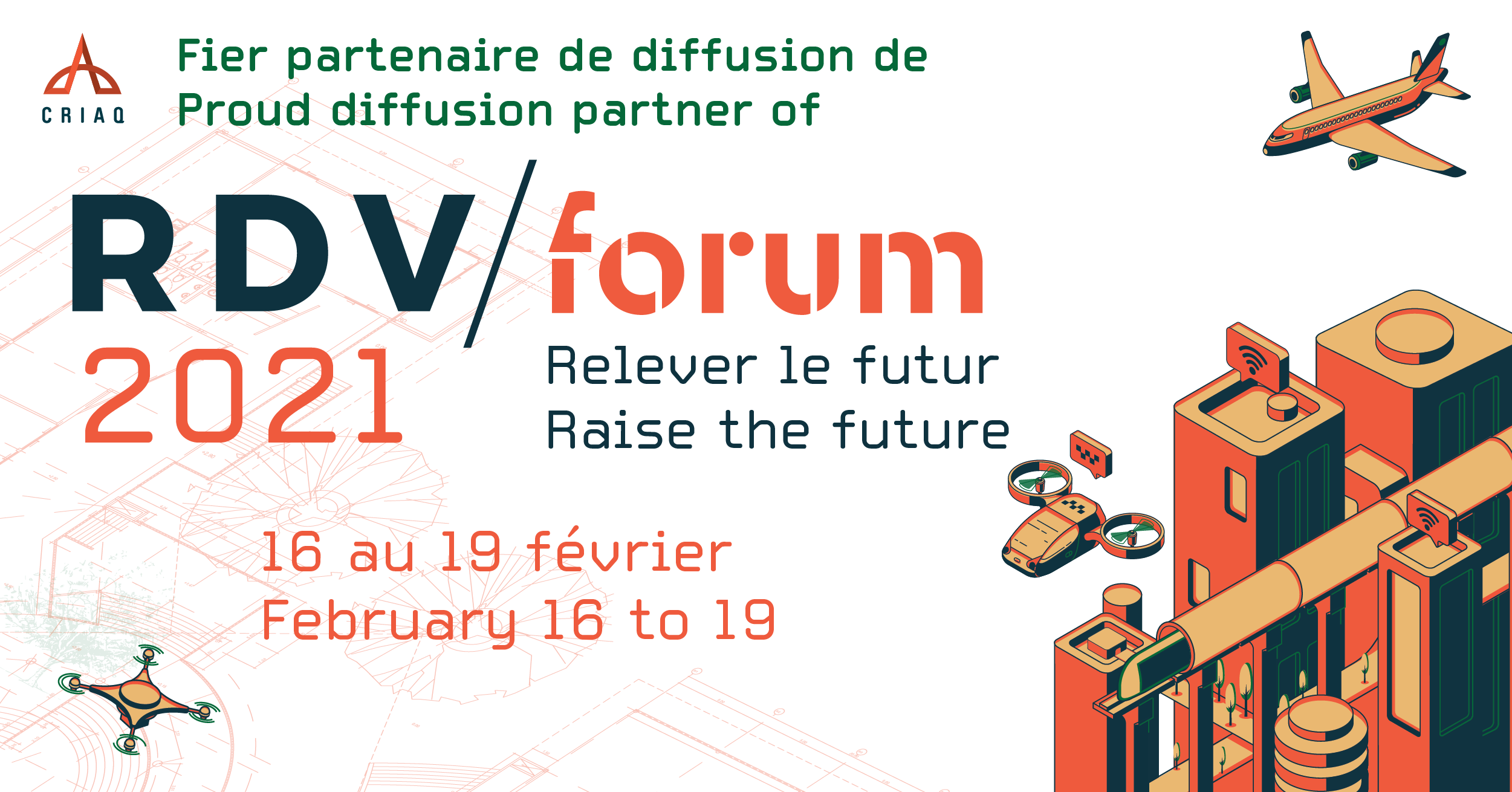Nous sommes fiers d’être partenaire du RDV Forum 2021 du CRIAQ, un événement majeur de la R et D collaborative en aérospatiale qui réunira environ 700 intervenants de l’industrie pour adresser les défis de la mobilité aérienne de demain.