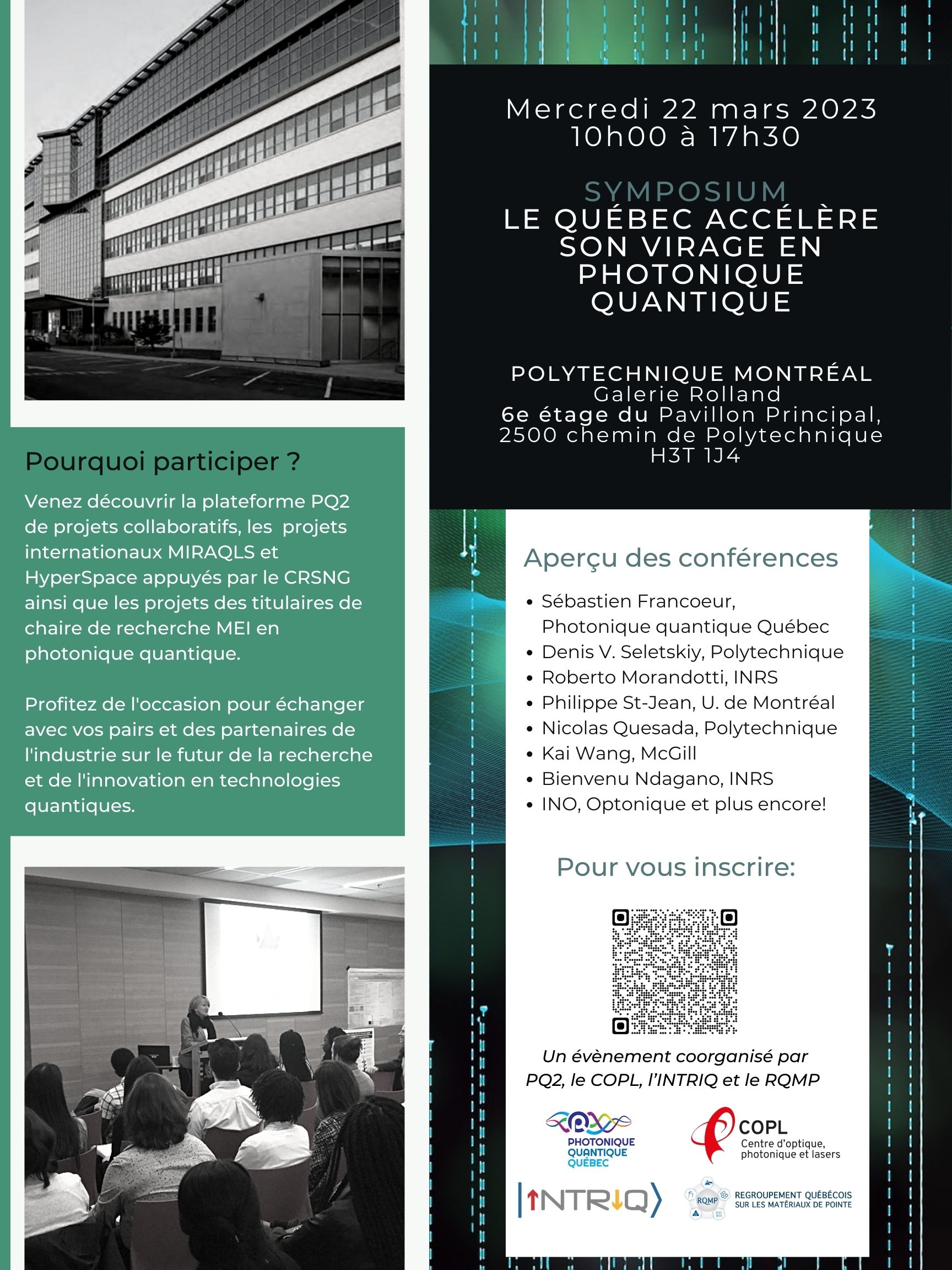 Vous êtes conviés à participer à ce Symposium le 22 mars dès 10h00 à Polytechnique Montréal. L’événement est organisé par Photonique quantique Québec (PQ2) et 3 regroupements stratégiques du Fond de Recherche du Québec – Nature et Technologie :