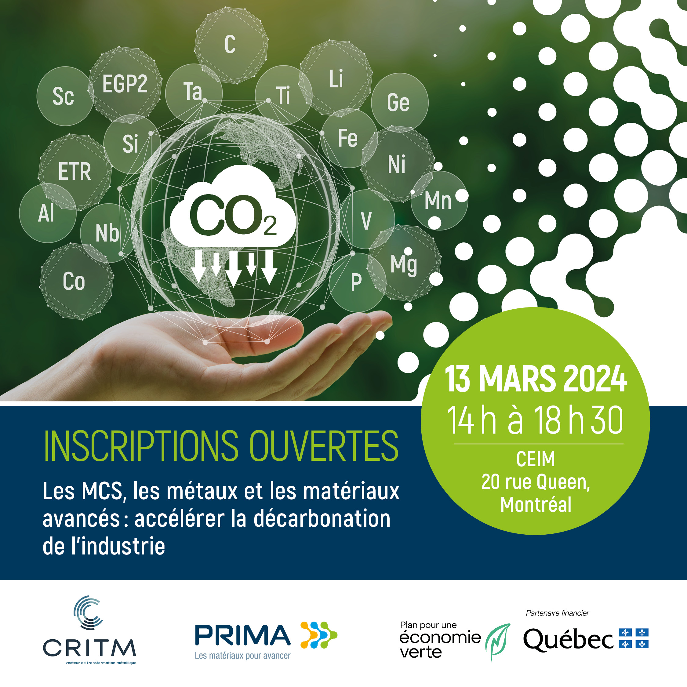 CEIM 20 rue Queen, Montréal, QC, CanadaLe CRITM et PRIMA Québec invitent les acteurs de leurs écosystèmes respectifs à en apprendre davantage sur la décarbonation, les trajectoires à poursuivre pour atteindre la carboneutralité, notamment par l’innovation. L’activité sera aussi l’occasion de présenter brièvement des programmes de soutien à l’innovation collaborative touchant plus particulièrement la réduction des GES et la valorisation des […]
