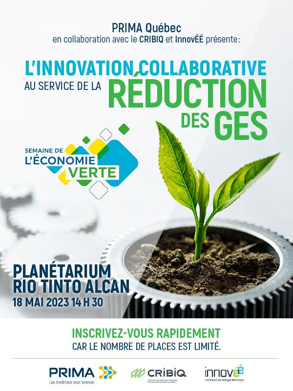 Planétarium Rio Tinto Alcan 4801 Av. Pierre-De Coubertin, Montréal, QC, CanadaDans le cadre de la semaine de l’économie verte du 15 au 19 mai 2023, en collaboration avec deux autres Regroupements Sectoriels de Recherche Industrielle (RSRI), CRIBIQ et InnovÉÉ, PRIMA Québec organise un événement le jeudi 18 mai 2023 sur l'innovation collaborative au service de la réduction des GES. D’ici 2030, le Québec s’est donné […]