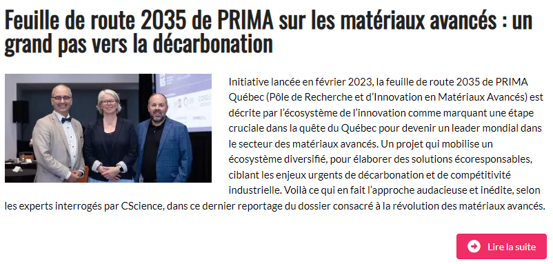 Le troisième reportage s’intitule « Feuille de route 2035 de PRIMA sur les matériaux avancées : un grand pas vers la décarbonation ». Il a été rédigé par Priscilla Freschu avec la participation de Marie-Pierre Ippersiel, présidente et directrice générale chez PRIMA Québec, Luc Pouliot, directeur général chez Polycontrols et Luc Sirois, Innovateur en chef du Québec.