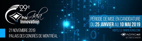 Le Gala des Prix Innovation de l’ADRIQ-RCTi, reconnu comme l’événement le plus prestigieux du milieu de l’innovation au Québec, se déroulera le jeudi 21 novembre 2019 au Palais des congrès de Montréal. La période de mise en candidature est le 10 mai 2019.