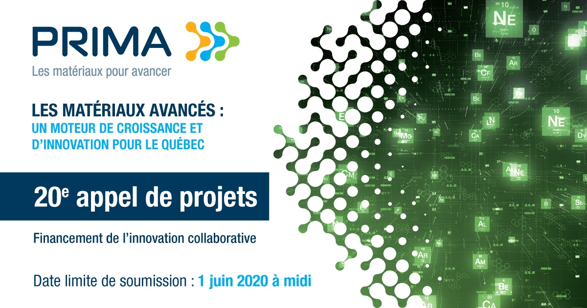 Pour appuyer la recherche et développement (R-D) collaborative dans les matériaux avancés, PRIMA Québec lance un appel de projets. Ce programme d’aide financière a été conçu afin de contribuer à l’établissement de collaborations entre l’industrie et le milieu de la recherche (universités, CCTT ou centres de recherche publics).