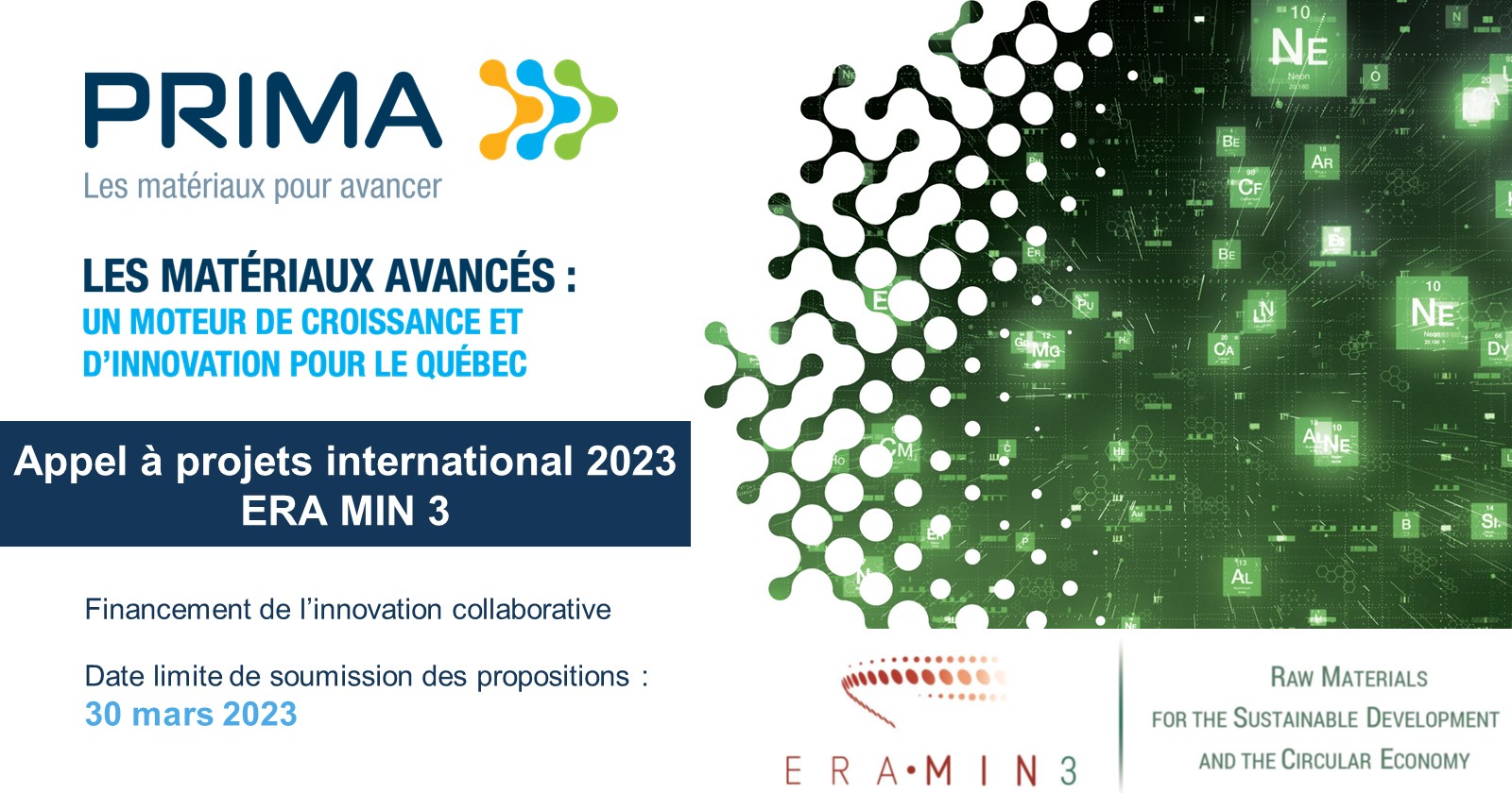 Pour appuyer la recherche et développement (R-D) collaboratif dans les matériaux avancés, PRIMA Québec lance un nouvel appel de projets international dans le cadre du PSO-International. Le PSO-International contribue à soutenir l’action internationale des acteurs québécois des milieux universitaire, collégial, institutionnel et industriel travaillant dans les différents créneaux de la recherche et de l’innovation. À cet effet, le ministère de l’Économie, de l’Innovation et de l’Énergie (MEIE) soutient PRIMA Québec dans sa participation à l’appel ERA-MIN 2023. Dans le cadre de cet appel, 21 agences de financement de plus de 17 pays européens et non européens y participent avec un budget total préliminaire d’environ 12,75 millions €.